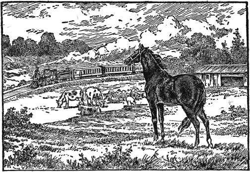 I shall never forget the first train that ran by. I was feeding quietly near the pales which separated the meadow from the railway, when I heard a strange sound at a distance, and before I knew whence it came—with a rush and a clatter, and a puffing out of smoke—a long black train of something flew by, and was gone almost before I could draw my breath. I galloped to the further side of the meadow, and there I stood snorting with astonishment and fear. In the course of the day many other trains went by, some more slowly; these drew up at the station close by, and sometimes made an awful shriek and groan before they stopped. I thought it very dreadful, but the cows went on eating very quietly, and hardly raised their heads as the black, frightful thing came puffing and grinding past. For the first few days I could not feed in peace; but as I found that this terrible creature never came into the field, or did me any harm, I began to disregard it, and very soon I cared as little about the passing of a train as the cows and sheep did.